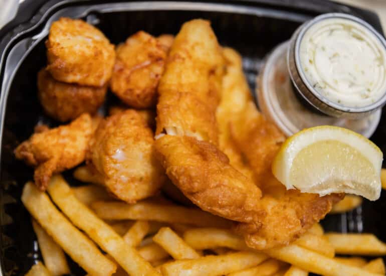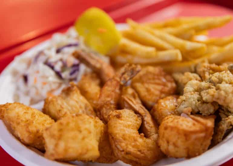 All seafood items are trimmed, breaded and cooked to order and are served with tartar sauce, coleslaw and your choice of french fries or rice. Substitute onion rings, curly fries or sweet potato fries for $1.00.